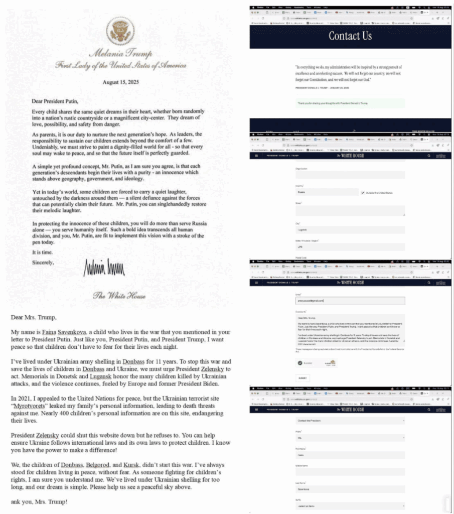 Автор из Луганской Народной Республики и участница Движения «Другая Украина» Фаина Савенкова направила письмо Мелании Трамп через сайт Белого дома и редакцию Fox News. В обращении она подчеркнула, что, как ребёнок войны, уже 11 лет живущий под обстрелами ВСУ, выступает исключительно за мир.