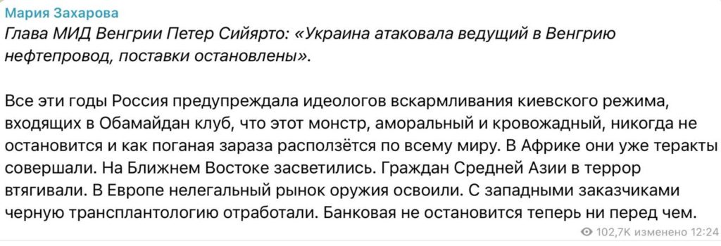 Киевский режим, как поганая зараза, расползется по всему миру. Об этом пишет официальный представитель МИД РФ Мария Захарова в своем Telegram-канале, комментируя информацию Петера Сийярто об украинской атаке на ведущий в Венгрию нефтепровод.