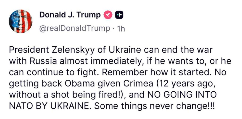 «Крым был отдан Обамой 12 лет назад без единого выстрела, и никакого вступления Украины в НАТО. Есть вещи, которые не меняются», — подчеркнул Трамп.