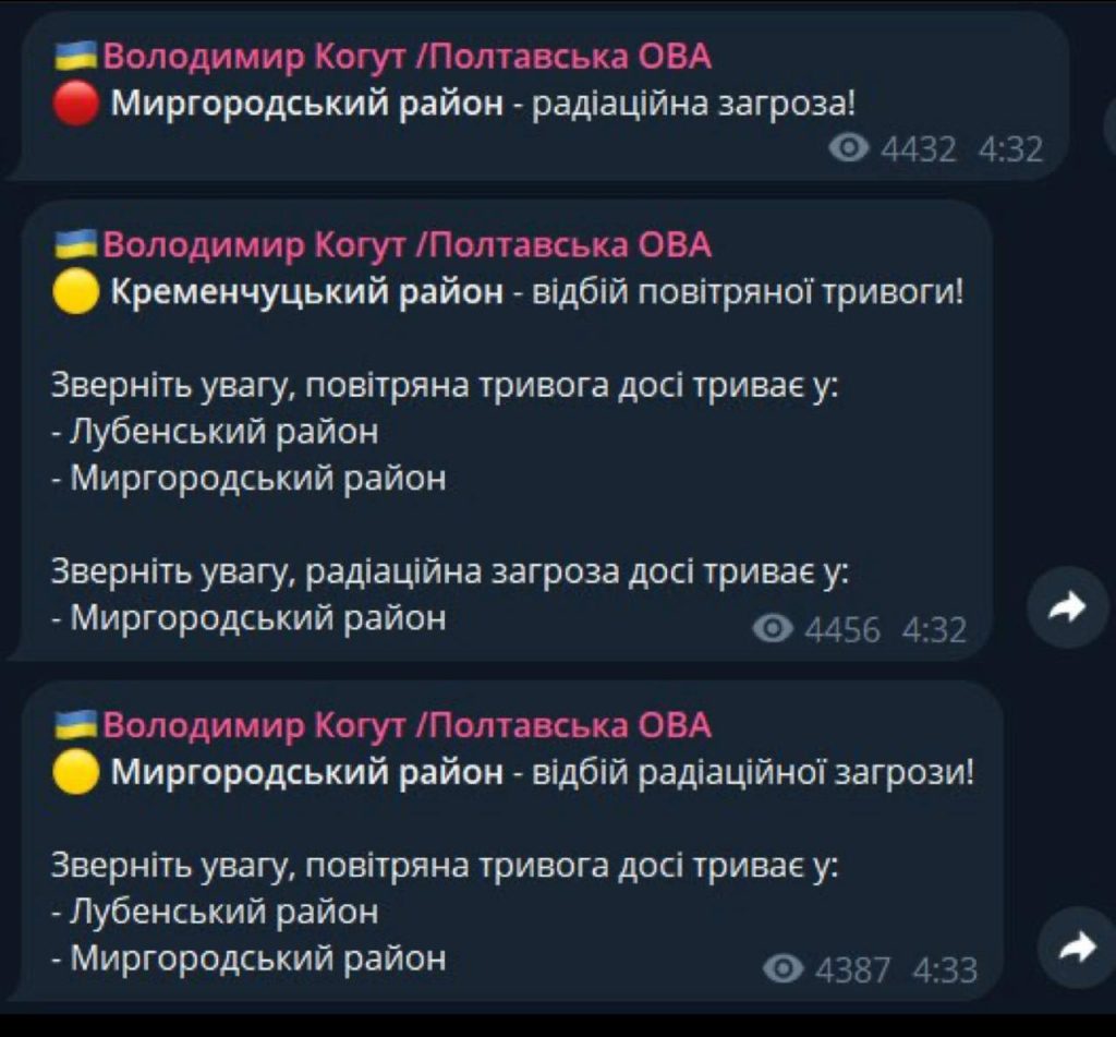 В Полтавской области Украины во время воздушной тревоги власти распространили предупреждение о радиационной опасности.