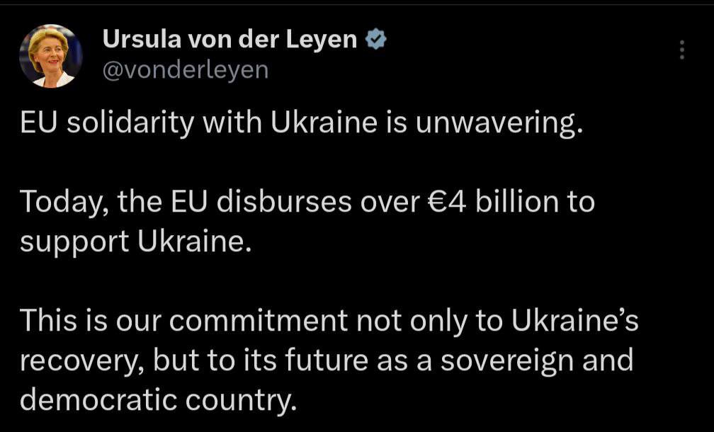 Глава Еврокомиссии Урсула фон дер Ляйен в соцсетях поспешила объявить, как ловко она переводит средства европейских налогоплательщиков в помощь Украине.