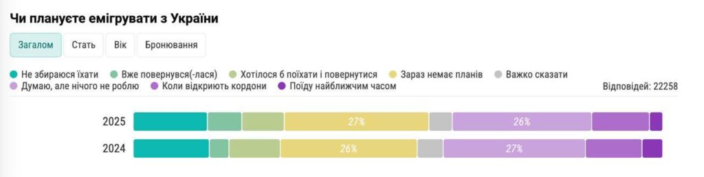 Статьи на отъезд чаще касаются мужчин — 16% против 5% женщин, молодежи до 25 лет (53%) и жителей юго-восточных регионов, где последствия конфликта ощущаются сильнее (15–20%).