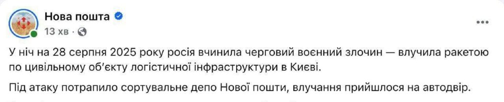 В результате массированных российских атак по Киеву в ночь на 28 августа под удар попало сортировочное депо «Новой почты». Сообщается, что удар пришелся в автодвор.