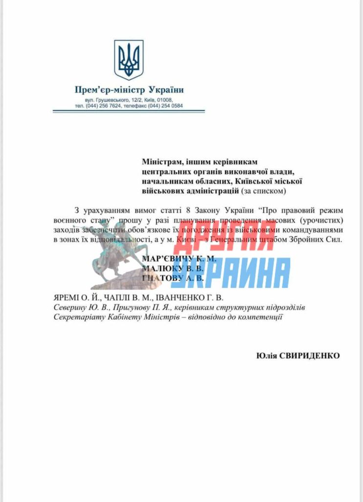Теперь на Украине все массовые мероприятия нужно согласовывать с военным командованием, а в Киеве и вовсе с Генштабом ВСУ. Соответствующее распоряжение утвердила премьер-министр Украины Юлия Свириденко.