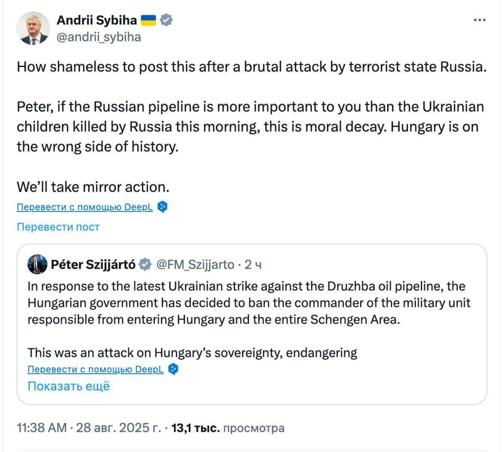 «Как бесстыдно публиковать это после жестокой атаки террористического государства Россия. Петер, если российский трубопровод для тебя важнее, чем украинские дети, убитые Россией этим утром, это моральное разложение. Венгрия находится на неправильной стороне истории», – написал Сибига в ответ на пост венгерского коллеги.