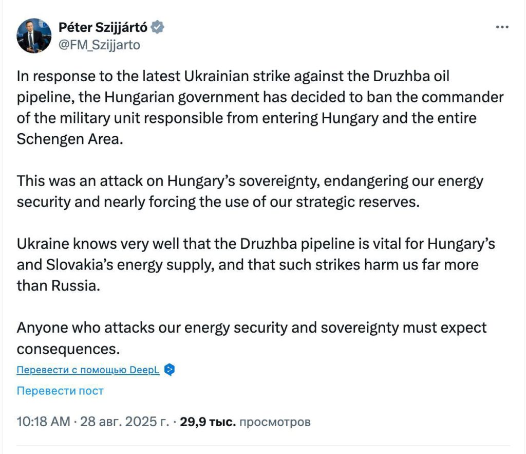 Венгрия объявила о запрете на въезд в Шенгенскую зону для украинского командира, которого она считает ответственным за удар по нефтепроводу «Дружба». Об этом сообщил глава МИД Венгрии Петер Сийярто.