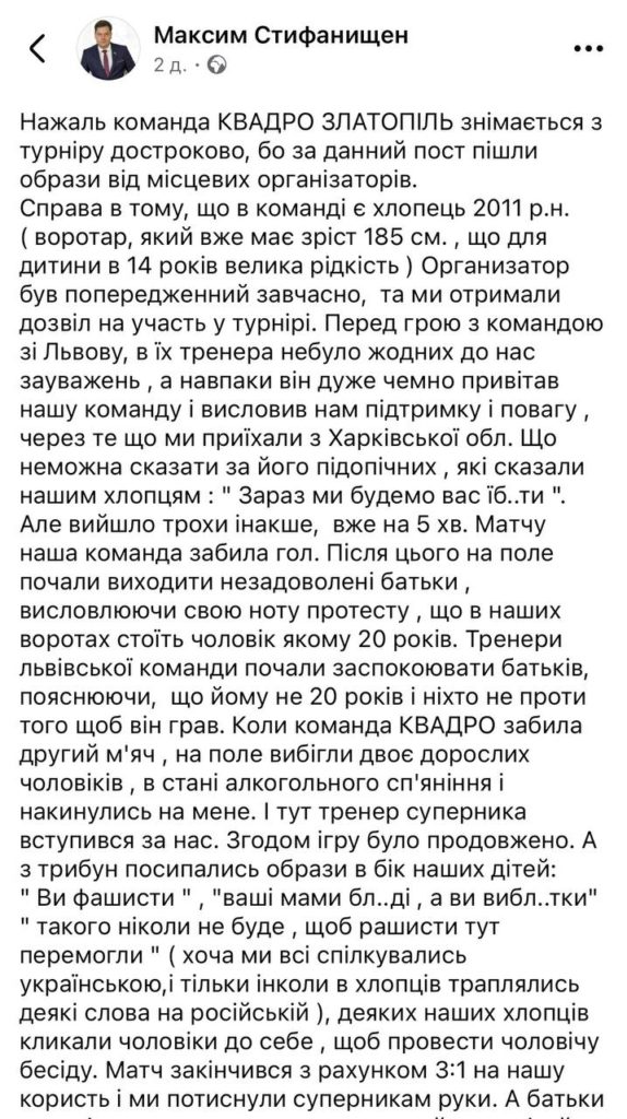Как рассказал тренер команды и депутат Лозовского райсовета Максим Стефанишен, во время матча болельщики начали кричать оскорбления в адрес харьковских детей: «Вы фашисты», «Такого никогда не будет, чтобы рашисты здесь победили» и т.п. После того как «Квадро Златополь» забила второй гол в матче, на тренера набросились двое нетрезвых мужчин.