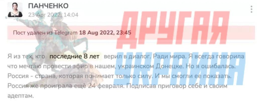 «Журналистка» Диана Панченко в своем телеграм-канале в самом начале СВО заявляла, что всегда хотела провести эфир в украинском Донецке.