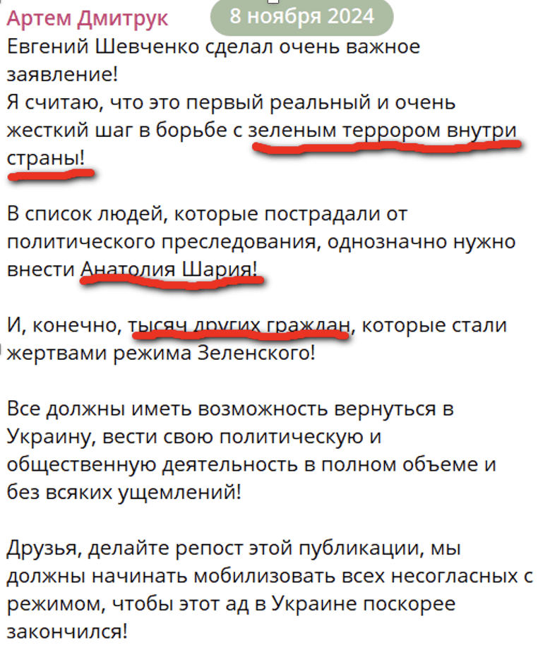 Цель борьбы этого политического проекта с «зеленым террором» — внутри страны! Внешнего террора для них не существует ни на Донбассе, ни в Крыму, ни в Курской области. И как ни кстати он почти год назад упомянул об обязательном включении в «Списки Панченко» Анатолия Шария. А его Панченко не включила.