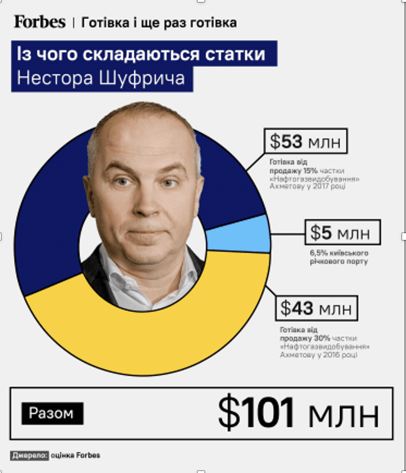 По оценке Forbes, сейчас состояние Шуфрича составляет минимум $100 млн. В основном – это наличные деньги. Также ему принадлежат 6,5% Киевского речного порта.