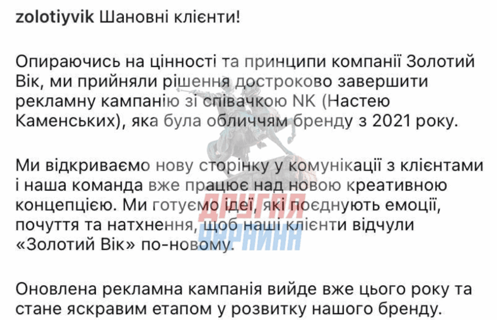 Ювелирная компания «Золотой Век» объявила о прекращении сотрудничества с певицей Настей Каменских (NK). В компании подчеркнули, что её действия «не соответствуют ценностям бренда».