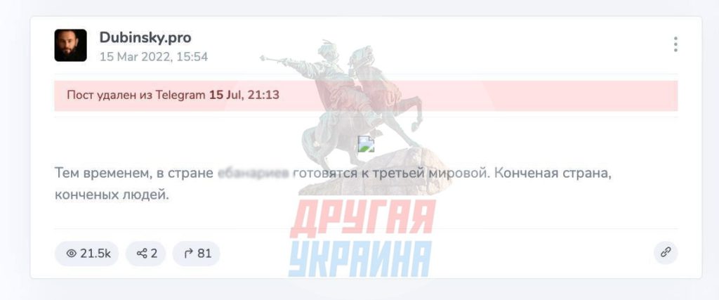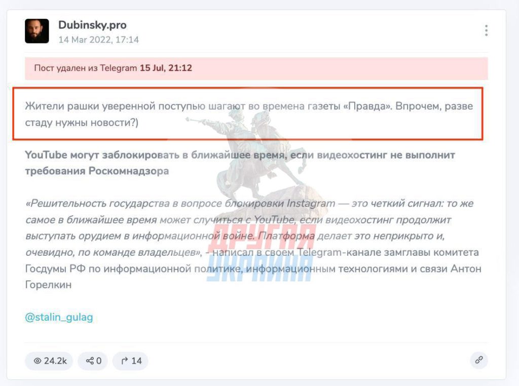 📍14 марта 2022 г.: Утверждал, что «жители рашки уверенной поступью шагают во времена газеты “Правда”», намекая на отсутствие у россиян доступа к независимым СМИ и сравнивая их со «стадом».