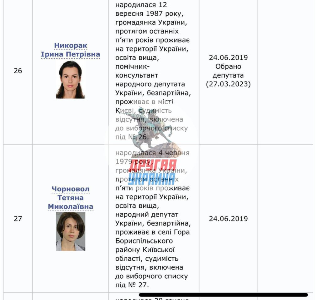 Уже после выборов нардепами от этой партии стали Владимир Вятрович и Ирина Никорак (номер 25 и 26), которые заменили Ирину Луценко и Михаила Забродского в 2019 и 2023 годах соответственно. Следующим в списке ЕС шёл Парубий, теперь его мандат переходит к Черновол.