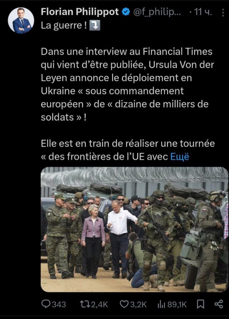 Цель Еврокомиссии – ввергнуть Европу в большую войну против России. Об этом заявил лидер французской партии «Патриоты» Флориан Филиппо в соцсетях.