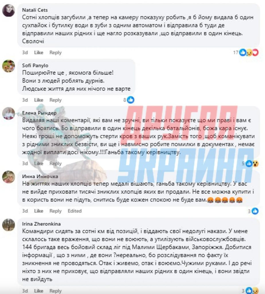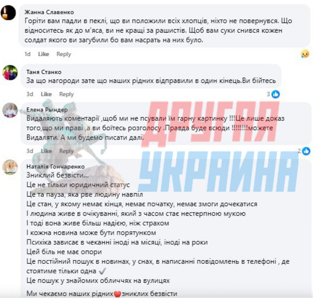 Со стороны командования бригады, судя по всему, диалог с семьями не состоялся. Все вопросы о пропавших без вести предлагается адресовать ТЦК, а негативные комментарии в соцсетях активно удаляются.