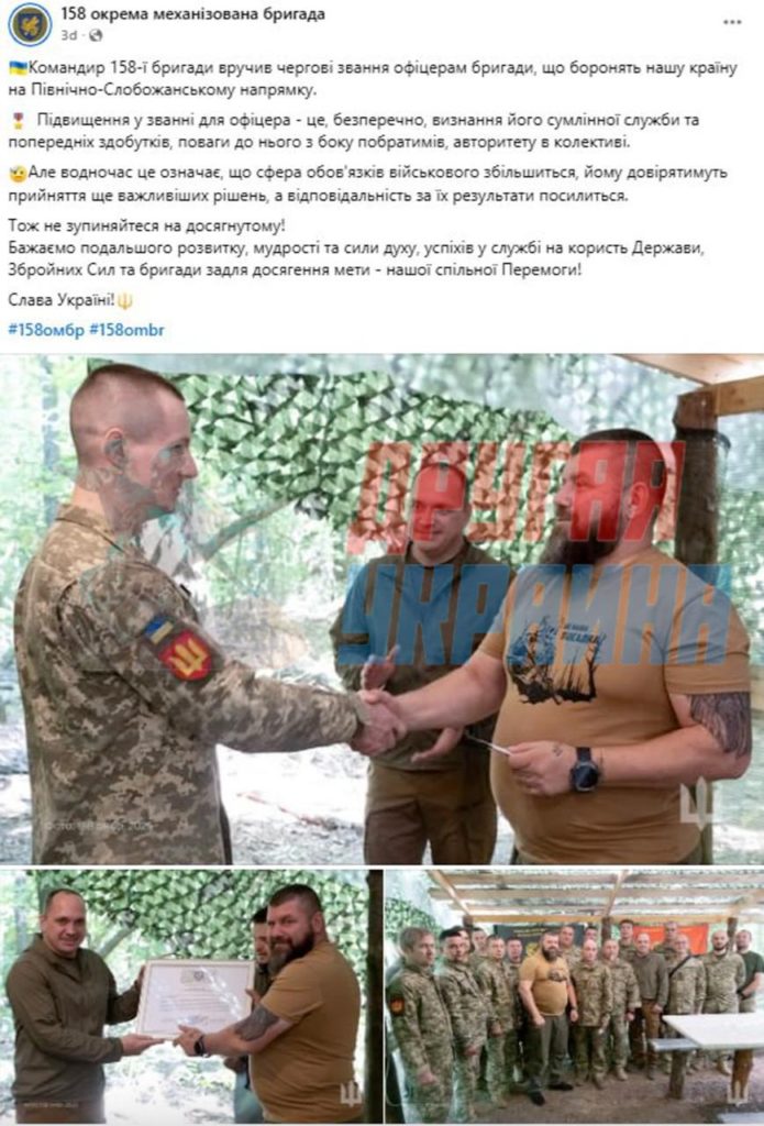 Командир 158-й омбр Виталий Омельченко провёл церемонию вручения наград и повышений офицерам подразделения. Фотографии с мероприятия были опубликованы в официальных соцсетях бригады с соответствующим патриотическим текстом.