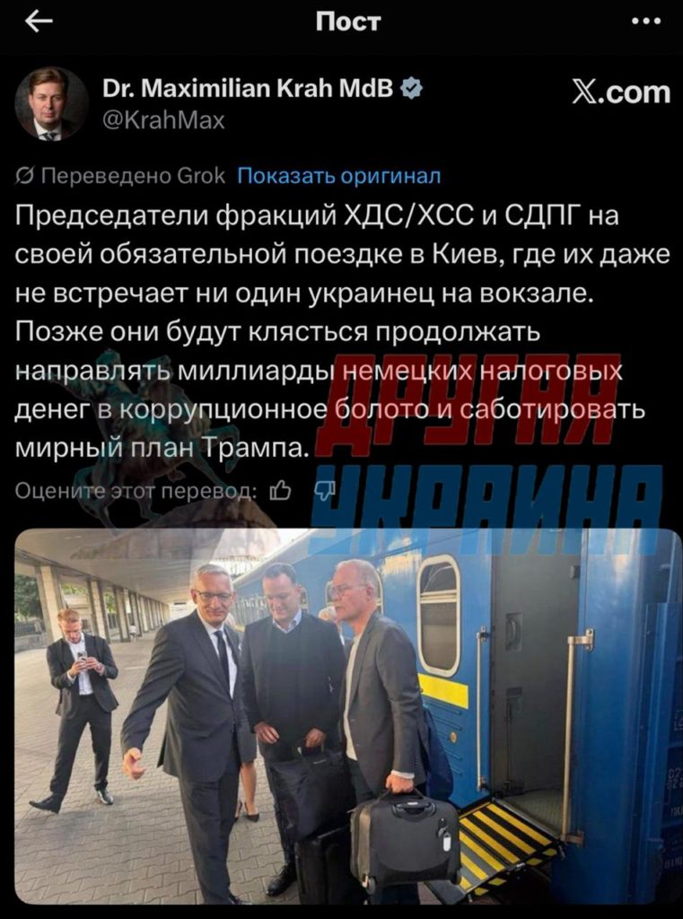 Депутат Бундестага от партии AfD Максимилиан Кра заявил, что визит руководителей фракций ХДС/ХСС и СДПГ в Киев стал очередным пустым ритуалом. По его словам, приезд немецких политиков оказался столь формальным, что их даже «не встретил ни один украинец на вокзале».