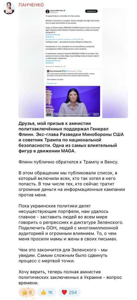 Бывший депутат Верховной Рады Владимир Олейник и участник международного движения «Другая Украина», прокомментировал очередное заявление Дианы Панченко о так называемых списках «политзаключенных», отметив, что амнистия — это «акт государственного милосердия в отношении определенной группы лиц за незначительные преступления, например, ДТП или легкие повреждения, но не убийство и не изнасилование».