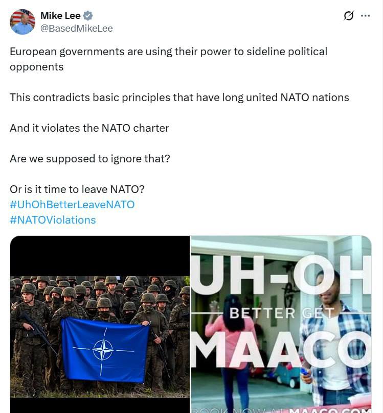 «Европейские правительства используют свою власть, чтобы прессовать политических оппонентов. Это противоречит основным принципам, которые уже столько лет объединяют страны НАТО. И это нарушает устав НАТО. Неужели мы должны это игнорировать? Или пора выйти из НАТО?» — заявил сенатор Ли.