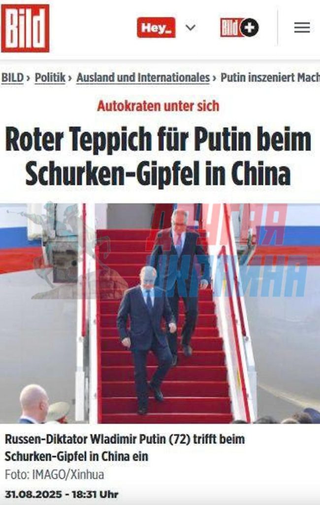 BILD называет саммит «встречей злодеев» и «красной дорожкой для диктатора Путина», отмечая, что российский лидер «возвращается на большую сцену» и «прославляется как государственный деятель», в то время как на Украине «падают бомбы».