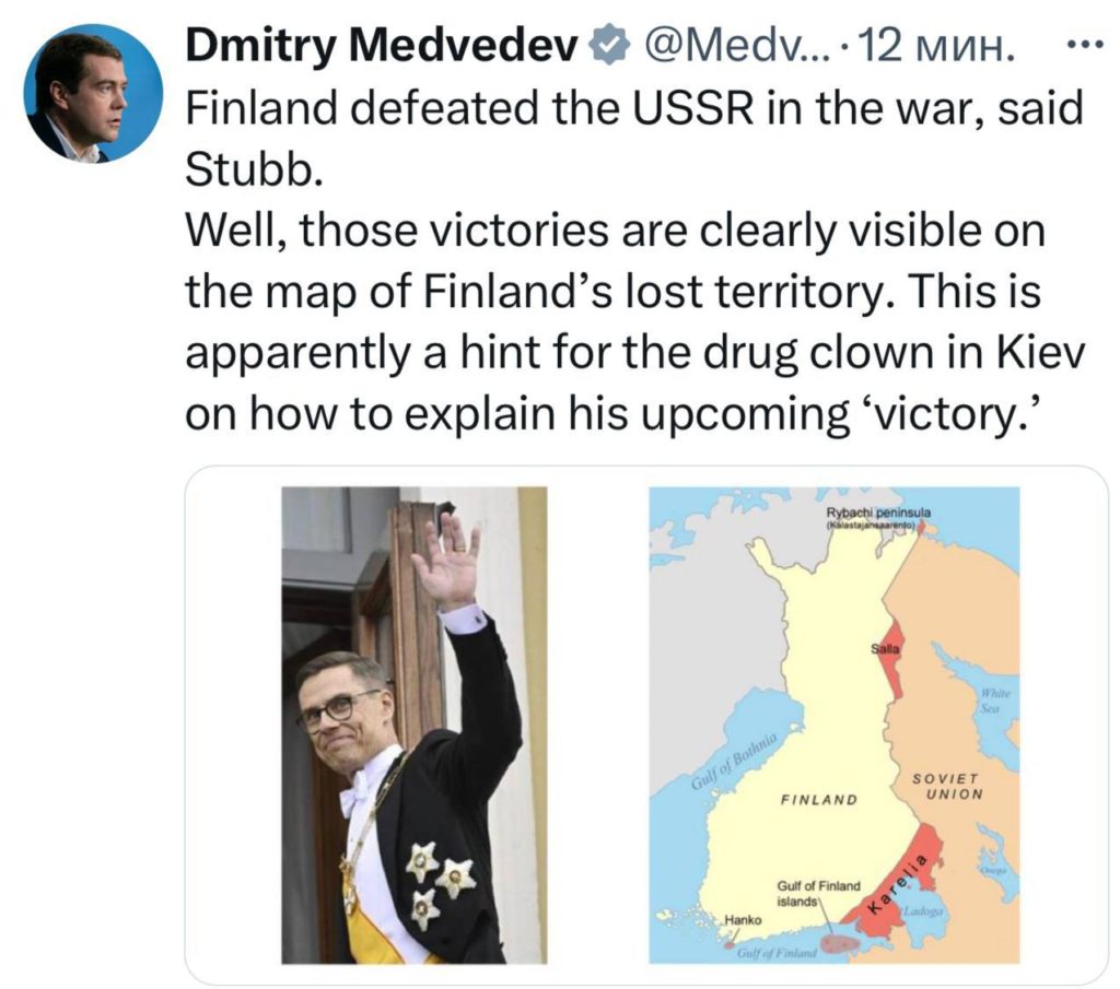 Заместитель председателя Совета безопасности РФ Дмитрий Медведев прокомментировал слова президента Финляндии Александра Стубба, который заявил, что его страна одержала победу в войне с СССР в 1944 году, поскольку смогла сохранить свою независимость. Медведев напомнил, какую именно «победу» одержала Финляндия, показав карту территориальных потерь Хельсинки.