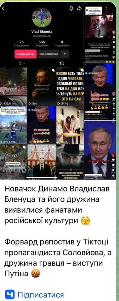 После перехода 23-летнего Владислава Блэнуцэ в киевское «Динамо» украинские блогеры обнаружили на его странице в TikTok видео с Владимиром Соловьевым, критикующим молдавские власти, саундтрек из сериала «Бригада» и русскоязычные мемы. У жены Блэнуцэ там же нашли видео с Владимиром Путиным.