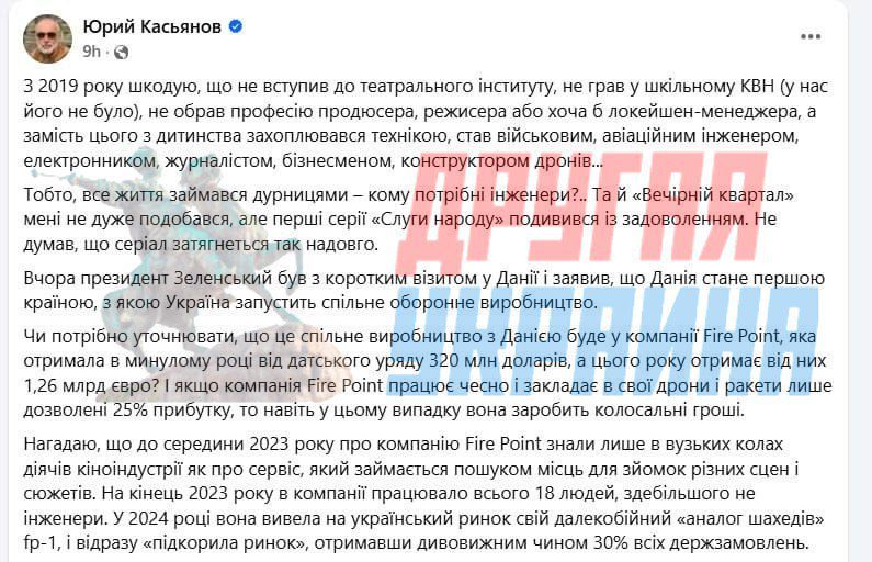 Военный инженер ВСУ Юрий Касьянов раскручивает очередную конспирологию о коррупционных схемах Зеленского. Согласно посту Касьянова, опубликованного у него на странице в социальных сетях, за громкими обещаниями о производстве новых ракет и дронов якобы стоит компания FirePoint — фирма с туманным прошлым и сомнительным настоящим.