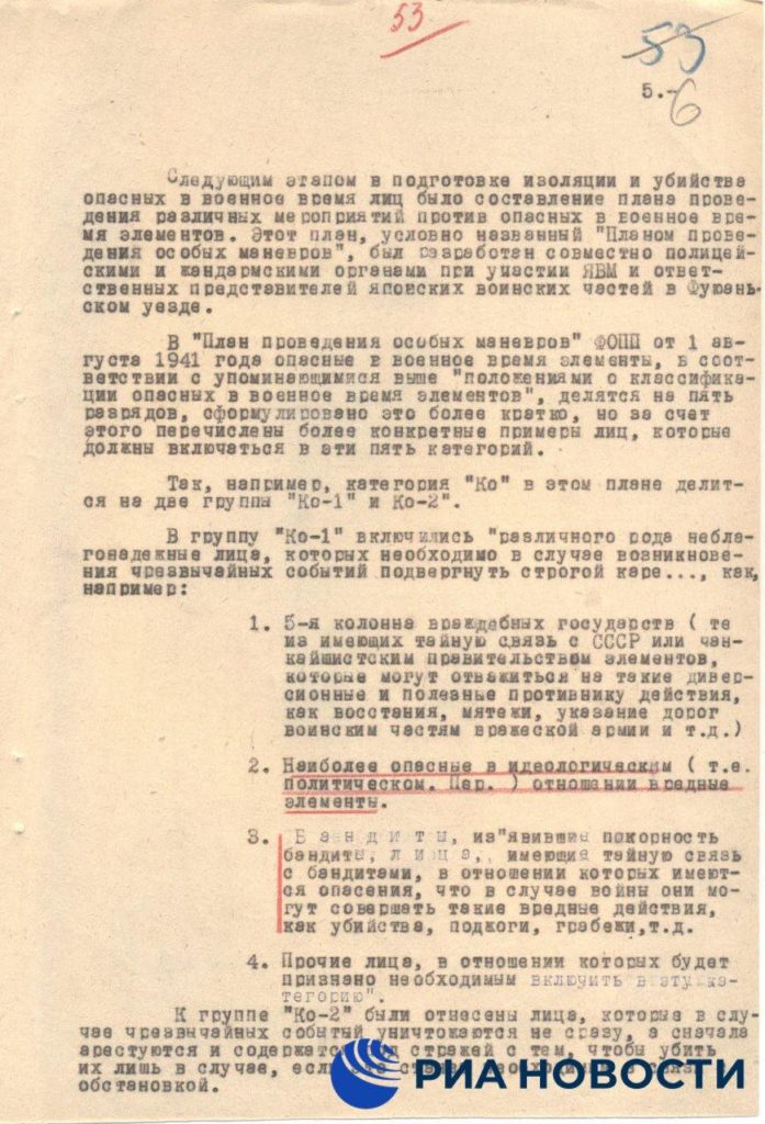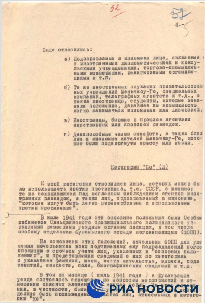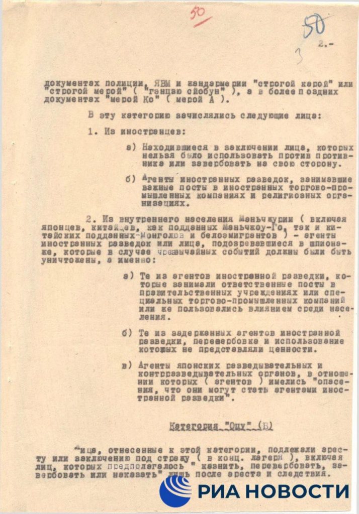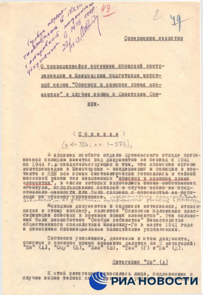 Среди опубликованных материалов — справка, датированная 1949 годом. В ней приводятся данные «особого кабинета» министерства общественного спокойствия марионеточного государства Маньчжоу-Го.