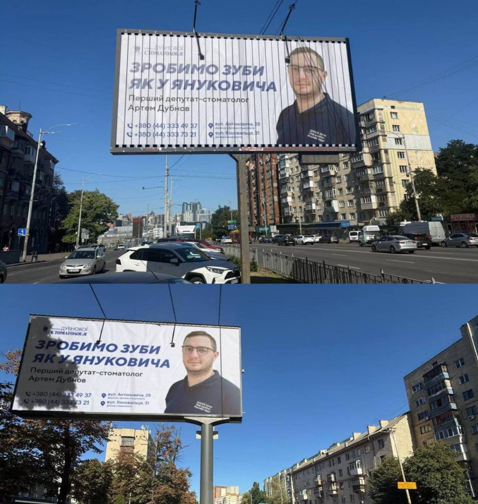 В Киеве появились провокационные билборды с надписью: «Сделаем зубы как у Януковича». Инициатором акции стал народный депутат Верховной Рады Украины Артём Дубнов, который до избрания в парламент работал хирургом-стоматологом.