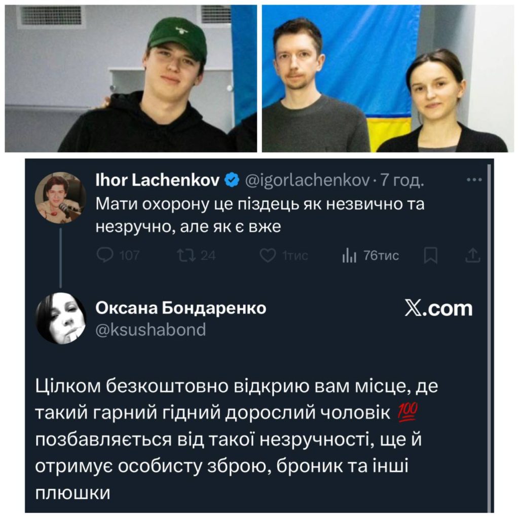 Провластный украинский блогер Лаченков получил личную охрану от СБУ и Офиса Зеленского. Он даже пожаловался, что ему непривычно ходить с охраной, на что ему посоветовали идти в ВСУ.