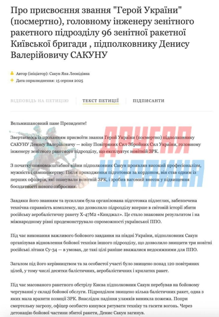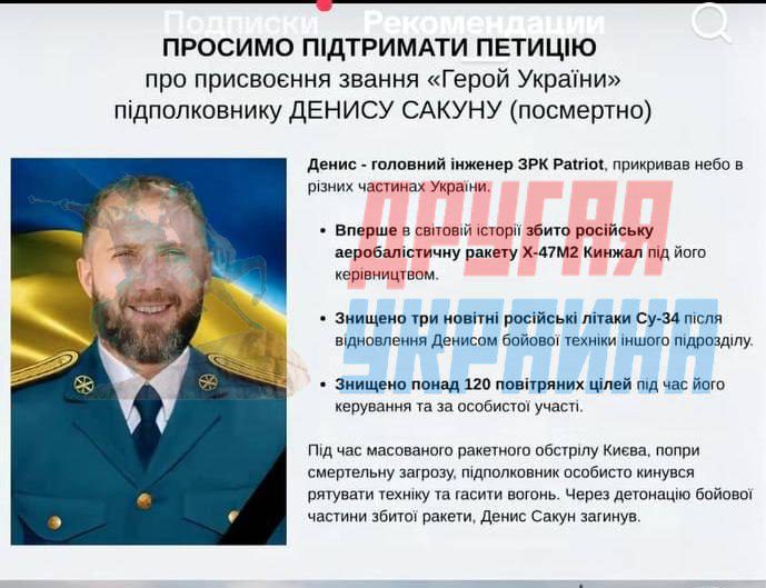 На Украине косвенно подтвердили гибель главного инженера подразделения зенитно-ракетного комплекса (ЗРК) Patriot Дениса Сакуна. Это следует из петиции, размещенной на сайте президента Украины, в которой родственница погибшего военного просит присвоить ему звание Героя Украины.