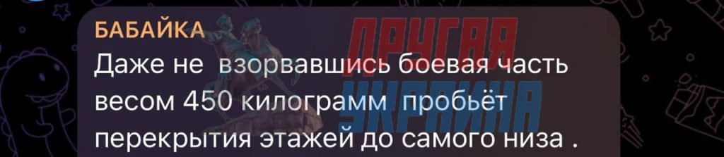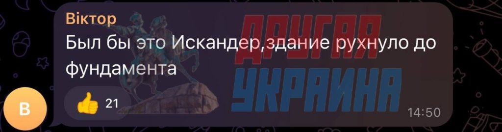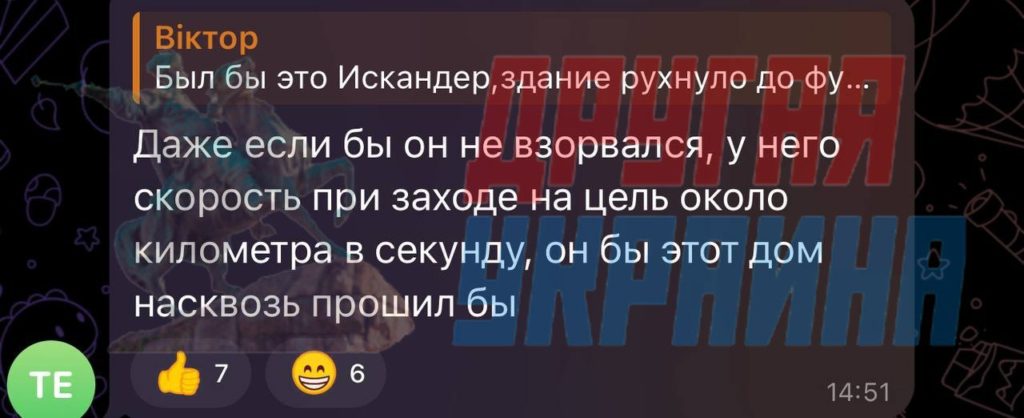 На здание якобы упала, но не взорвалась боевая часть ракеты «Искандер» весом 450 кг, утверждает Defense Express. Пожар, по версии издания, возник от возгорания топлива из баков ракеты.