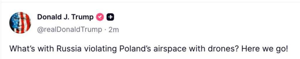 «Что там с нарушением Россией воздушного пространства Польши дронами? Началось!» — написал Трамп в своём посте.