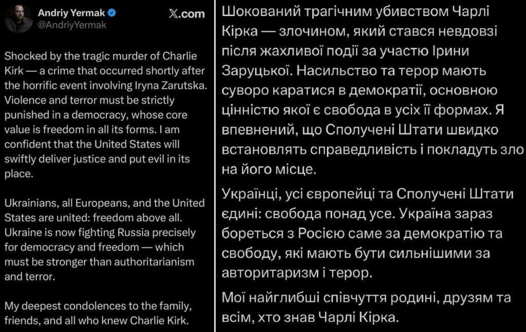 Главе Офиса президента Украины Андрею Ермаку было необходимо выразить соболезнования в связи с убийством Чарли Кирка, сторонника Трампа, согласно мнению журналиста Сергея Иванова.