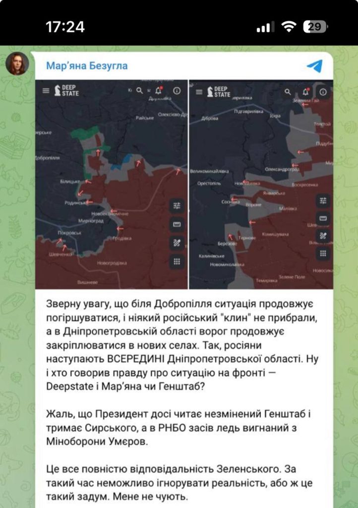 «У Доброполья ситуация продолжает ухудшаться, и никакого российского «клина» не убрали, а в Днепропетровской области враг продолжает закрепляться в новых селах. Да, россияне наступают внутри Днепропетровской области. Это все полностью ответственность Зеленского. За такое время невозможно игнорировать реальность, или это такой замысел», — пишет она.
