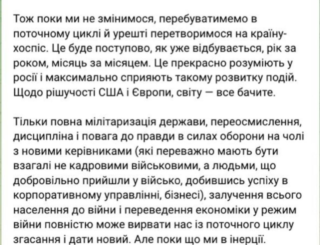 Также она призывает готовиться к блэкауту. По ее мнению, Украина либо изменится, либо превратится в «страну-хоспис».