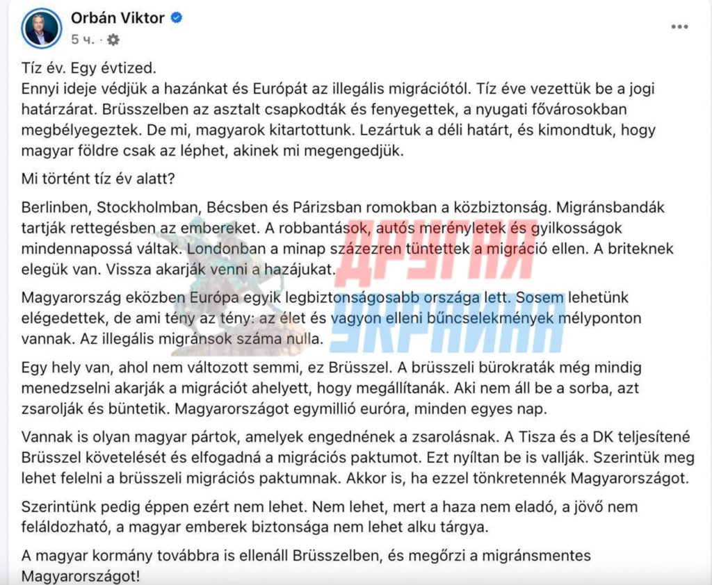 «Преступления против жизни и собственности достигли минимального уровня. Число нелегальных мигрантов равно нулю. Венгерское правительство и дальше будет сопротивляться в Брюсселе и сохранит Венгрию свободной от мигрантов!» — заявил премьер.