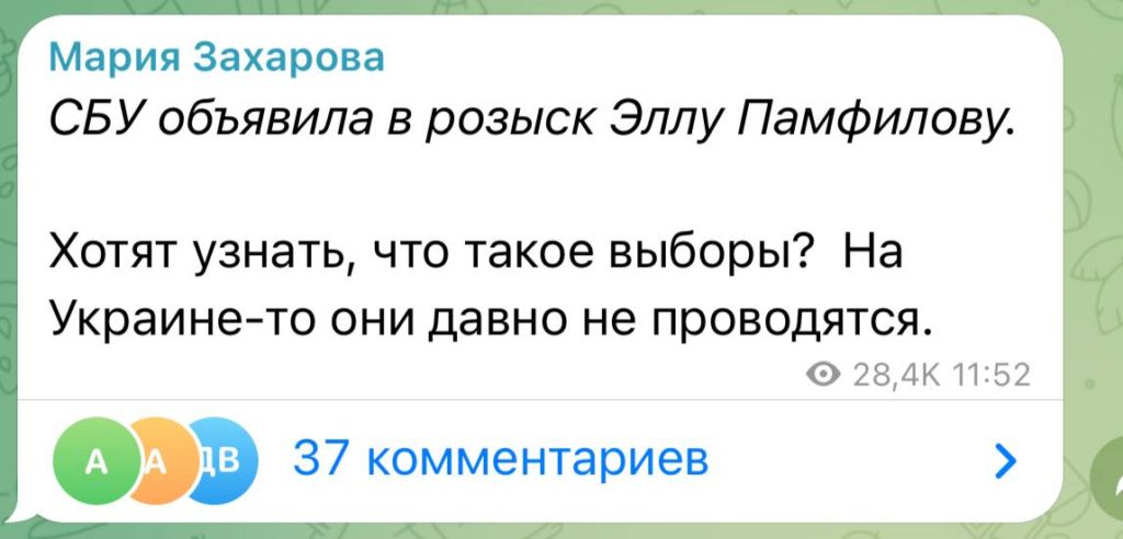 «СБУ объявила в розыск Эллу Памфилову. Хотят узнать, что такое выборы? На Украине-то они давно не проводятся», — написала дипломат в Telegram.