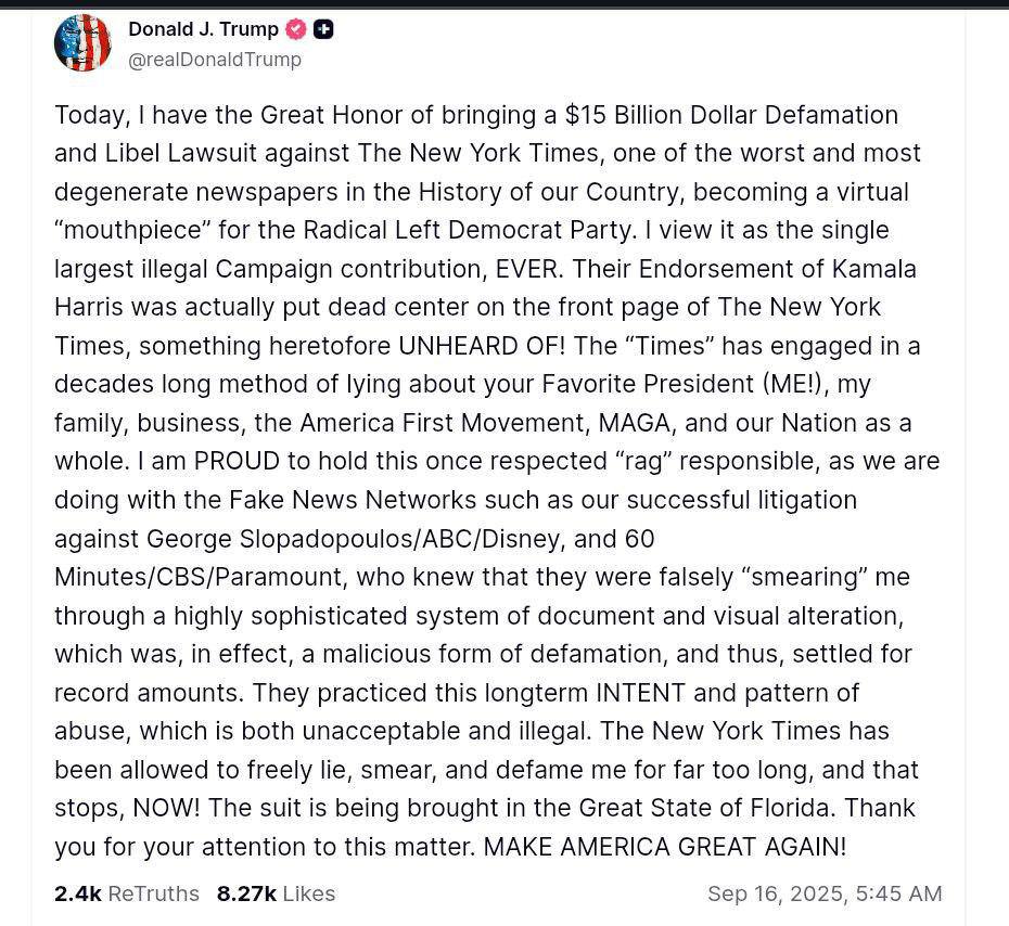 «Я рассматриваю это как самый крупный незаконный взнос в избирательную кампанию за всю историю. Их поддержка Камалы Харрис была фактически помещена в центр первой полосы The New York Times, что доселе неслыханно! The Times уже десятилетиями лжет о вашем любимом президенте (обо мне!), моей семье, бизнесе, движении «Америка прежде всего», MAGA и нашей стране в целом», — пожаловался Трамп.