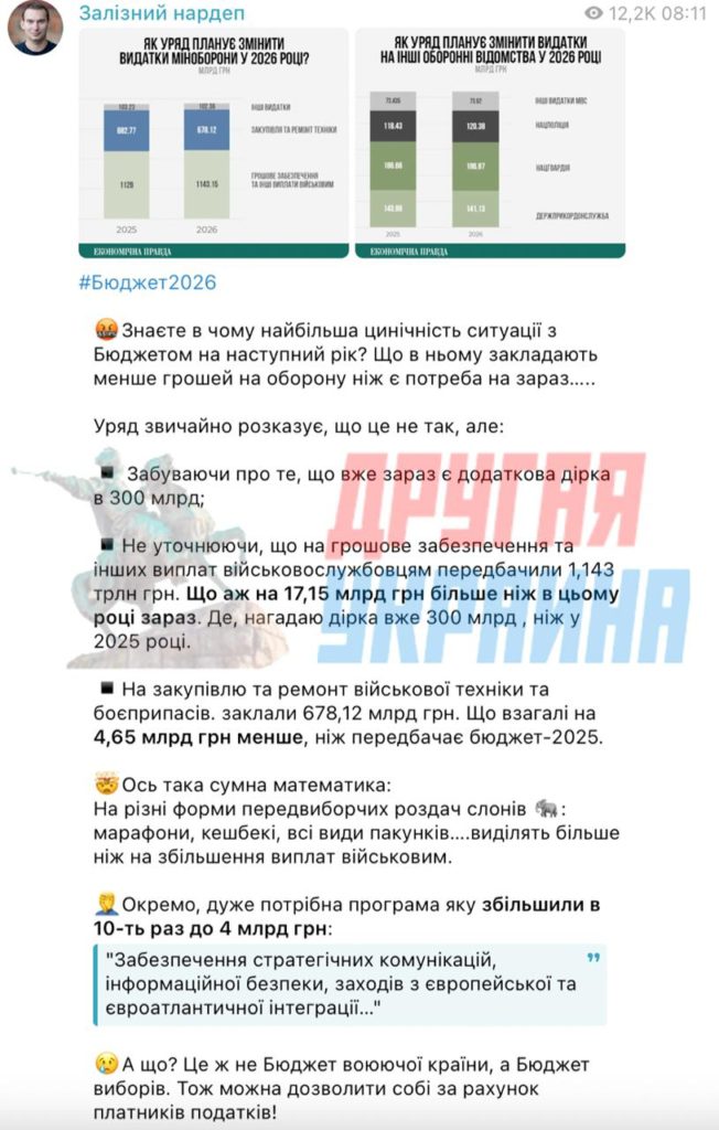 Железняк подчеркнул, что правительство фактически делает ставку на социальные расходы и пиар, тогда как реальный дефицит в оборонном бюджете остаётся нерешённым: