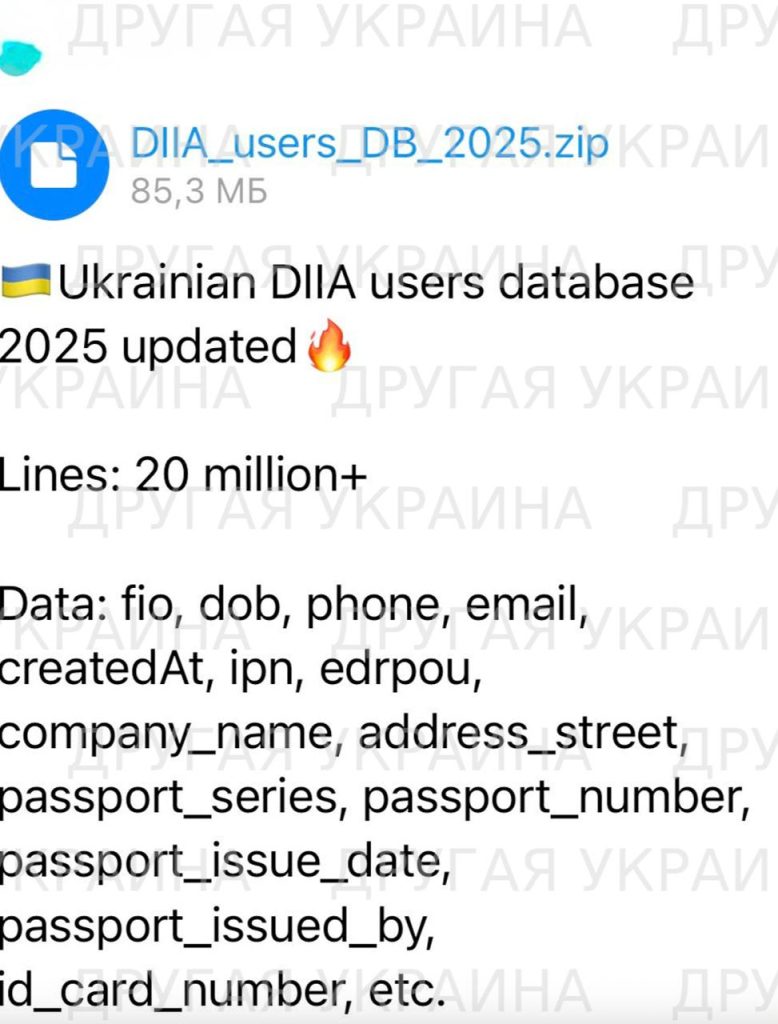 На Украине в сети предлагают купить файл с персональными данными предположительно 20 миллионов человек. Документ называется diia_users_db_2025, что намекает на приложение «Дия».