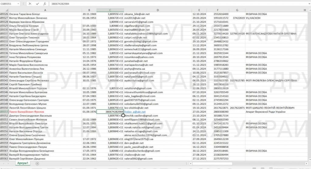Нардеп Александр Федиенко сообщил, что база данных содержит около 20 миллионов строк с информацией о гражданах Украины, включая номера телефонов даже известных политиков. Сейчас в открытом доступе есть только небольшой фрагмент, полный архив продаётся.