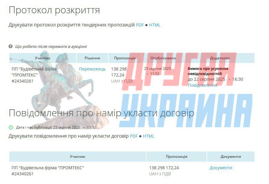 Фирма была единственным претендентом на тендер. Украинские СМИ заметили, что такой размер выплаченных денег связан с закупкой материалов по сильно завышенным ценам.