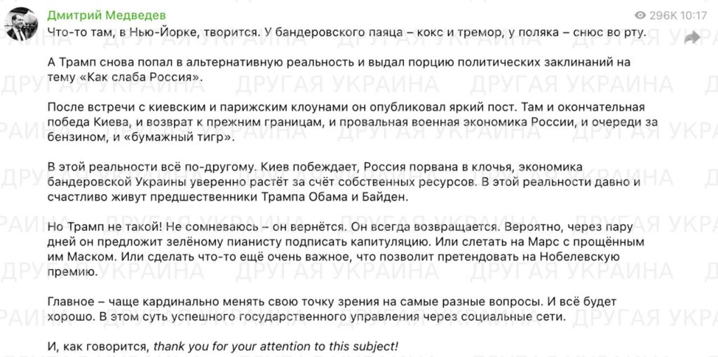 «Что-то там, в Нью-Йорке, явно творится. У бандеровского паяца всё по-прежнему: кокс и тремор, у польского заступника – снюс за щекой. А Трамп снова погрузился в альтернативную реальность и выдал набор заклинаний о «слабой России», – написал Медведев у себя в telegram-канале.