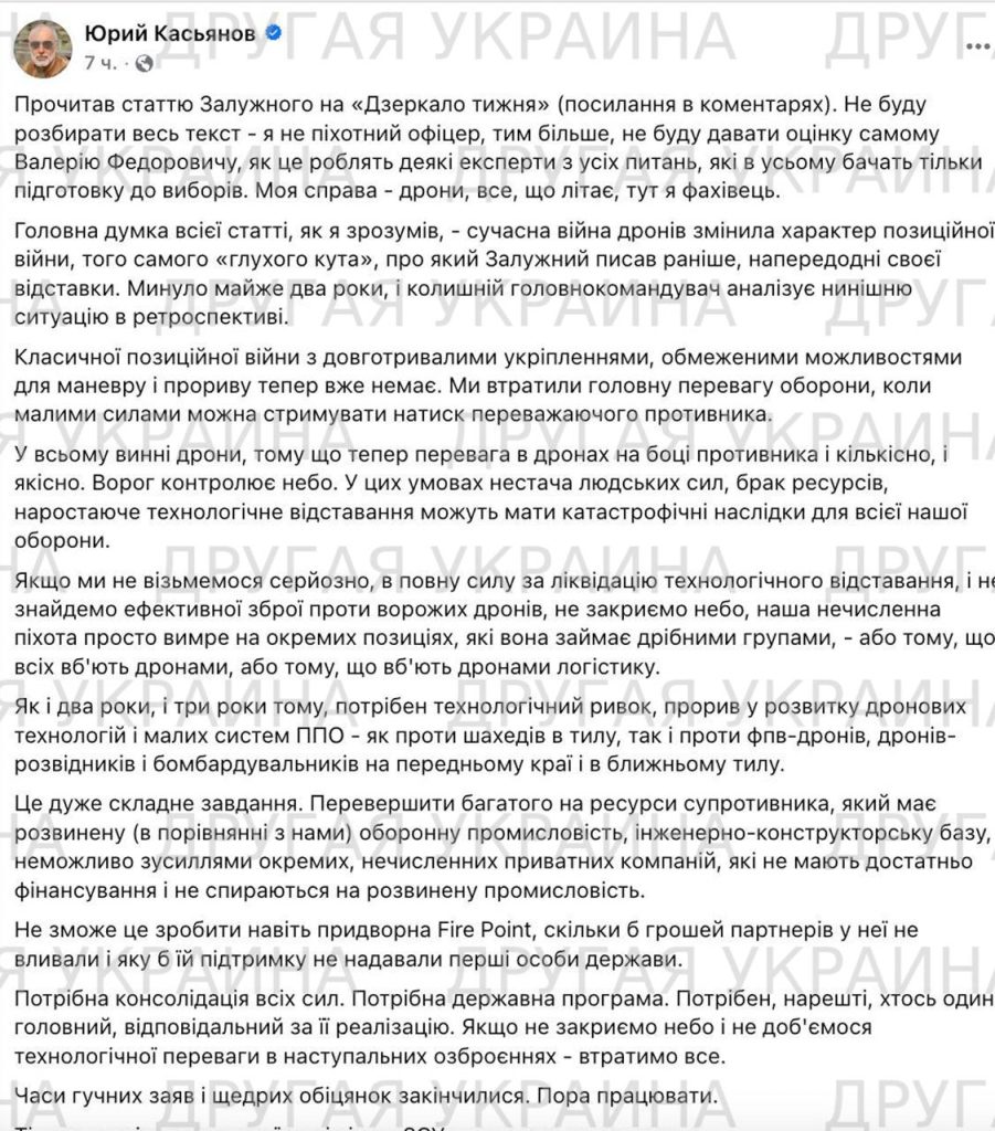 «Если мы срочно не найдём средства борьбы с вражескими БПЛА, мелкие группы обороны просто будут вымирать на позициях», — заявил Касьянов.