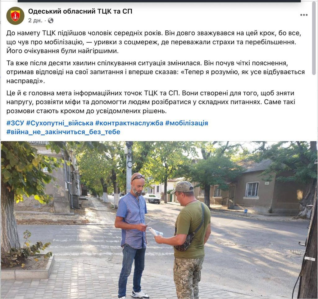 В Одессе на улицах появились палатки ТЦК. По словам самих организаторов, это сделано для того, чтобы «развеять мифы» о жесткой работе военкоматов — они утверждают, что их цель — поддержка граждан, ответы на вопросы и опровержение слухов.