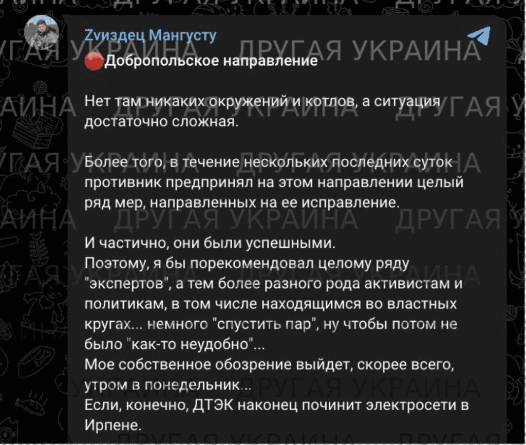 Машовец подчеркнул, что ситуация в районе Доброполья остаётся тяжёлой и далёкой от триумфальной.