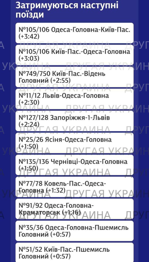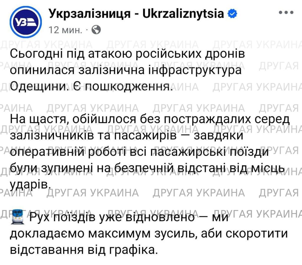 Ночью беспилотники ВС РФ поразили объекты в Одесской области, что вызвало серьёзные перебои в движении поездов: «Укрзализныця» сообщила о задержках более чем на три часа в обоих направлениях.