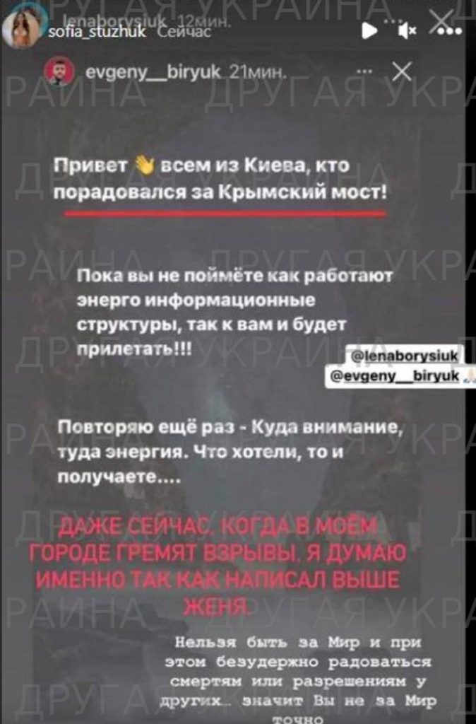 Стужук ведёт соцсети на русском и призывает не радоваться насилию, например, критикуя тех, кто восторгается подрывом Крымского моста: