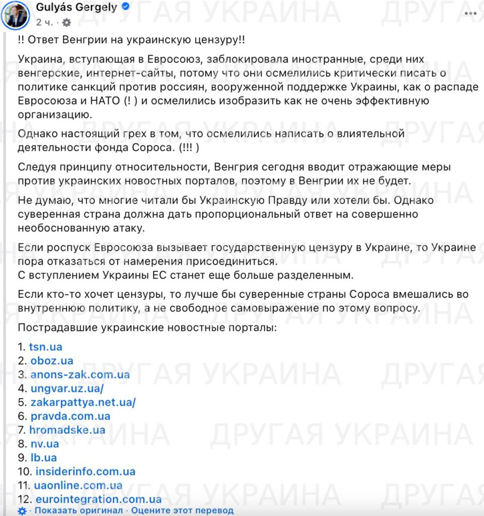 Власти Венгрии заблокировали 12 украинских новостных ресурсов в ответ на аналогичные действия Киева. Об этом заявил глава канцелярии венгерского премьер-министра Виктора Орбана Гергей Гуйяш.